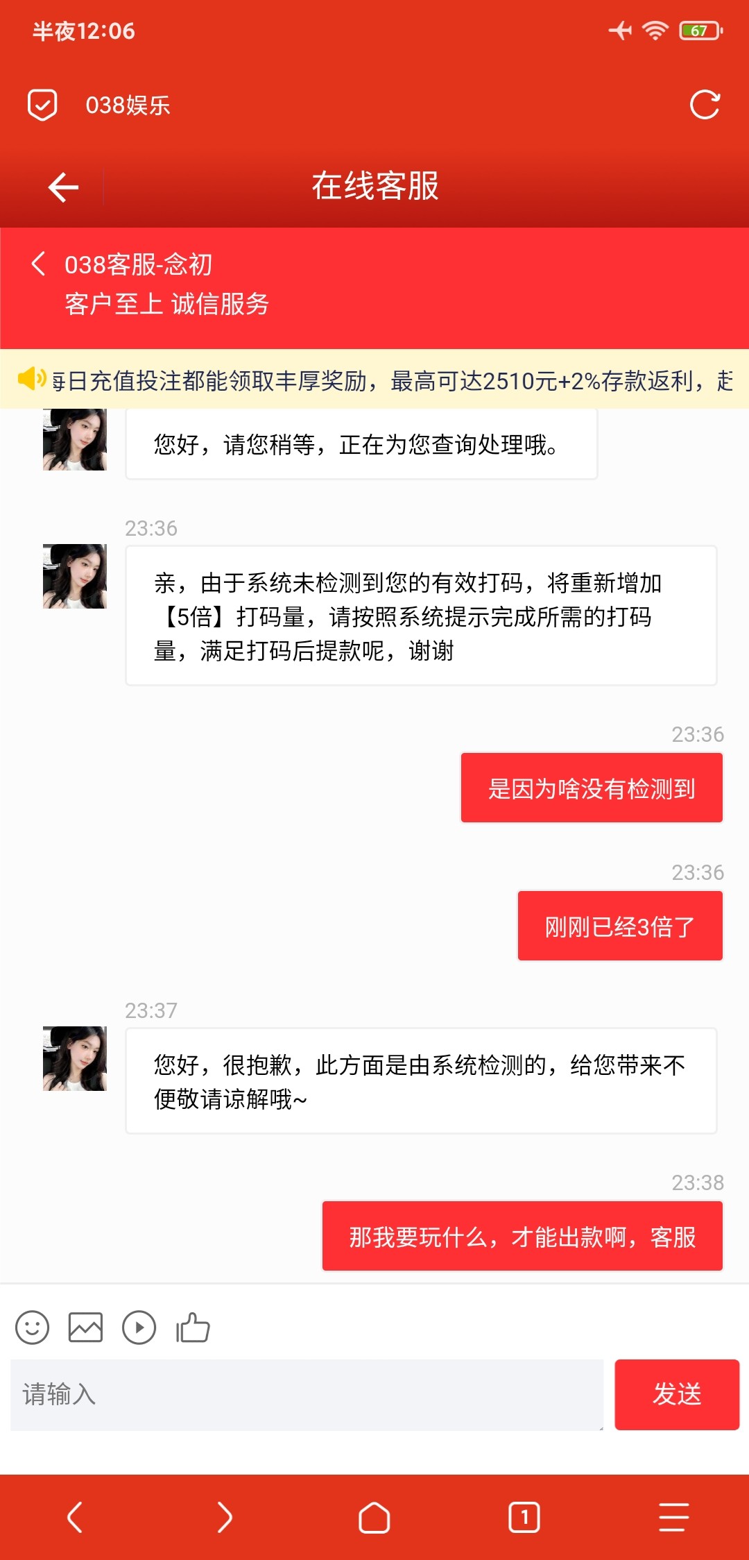 本来充了1000玩AG,牛牛,赢到3900,然后提款成功了1905,剩下2000给我罚了流水,无限套娃,还好本金已经提出来了,哎,避雷