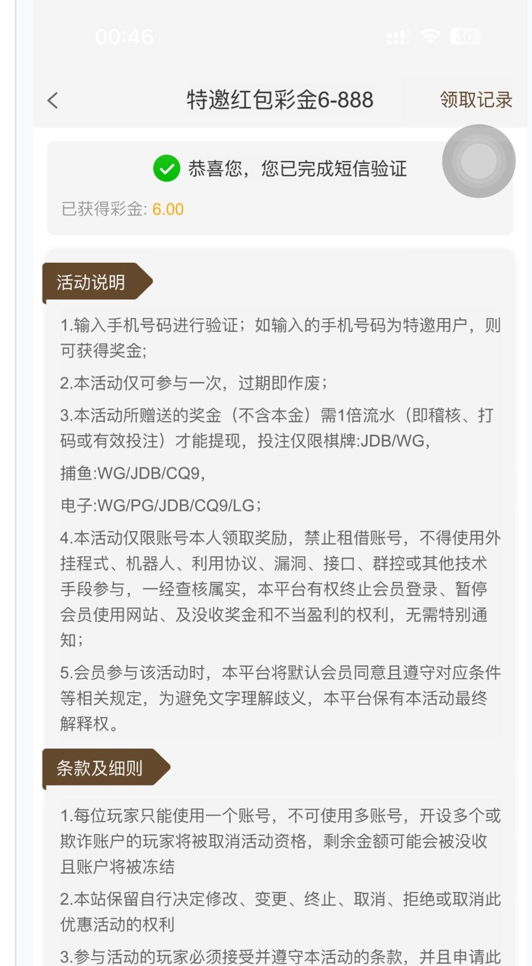 刚打来电话,送了8块回访彩金