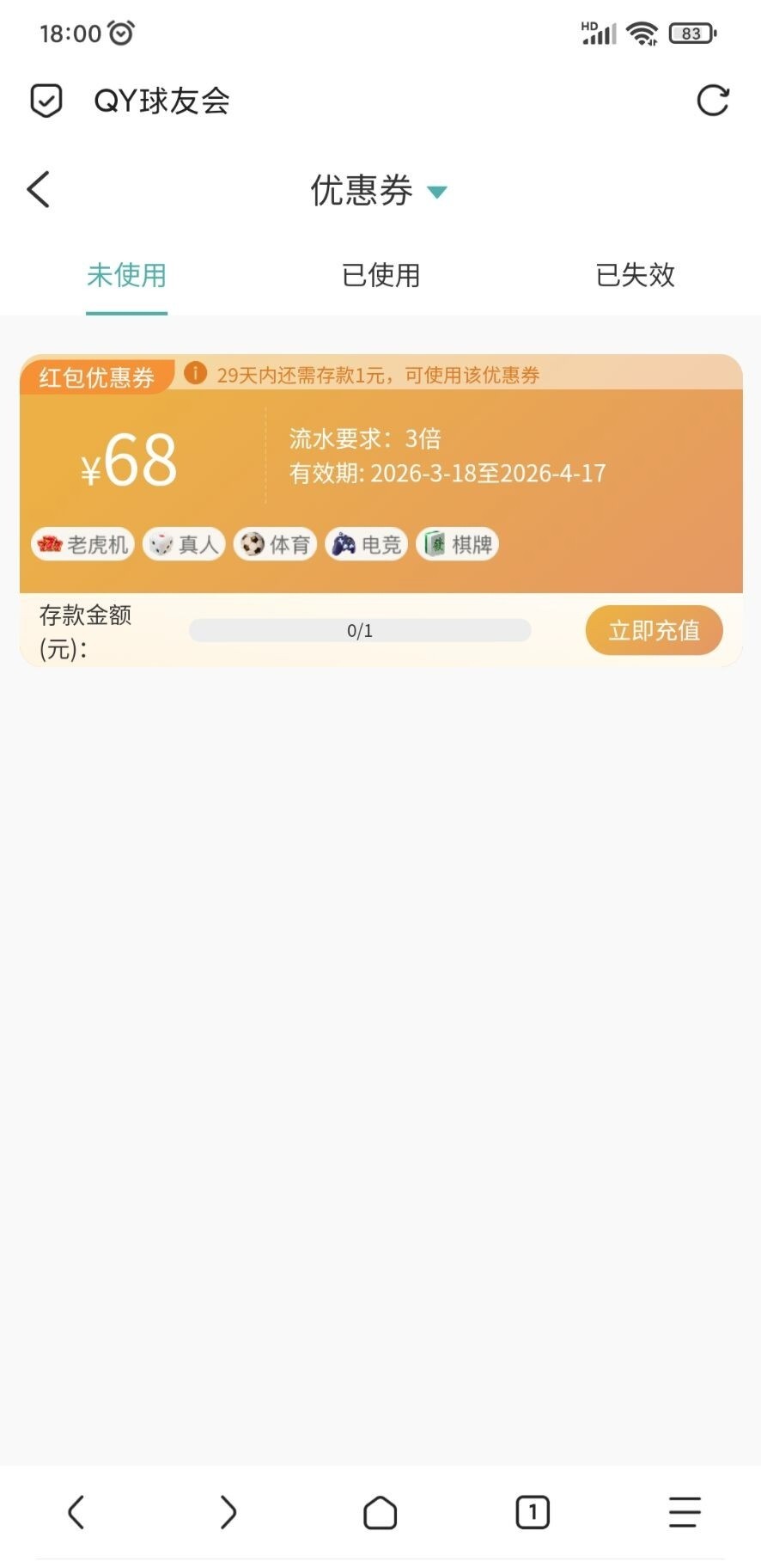 链接qyh.vip 球友会 红包卷68 存款1元即可 有号的看看。