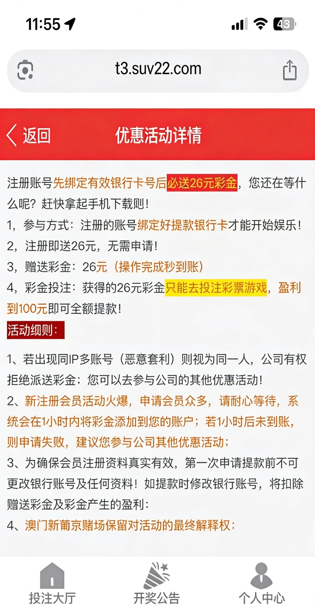 注册绑定银行卡秒送26彩金只能彩票一百提款