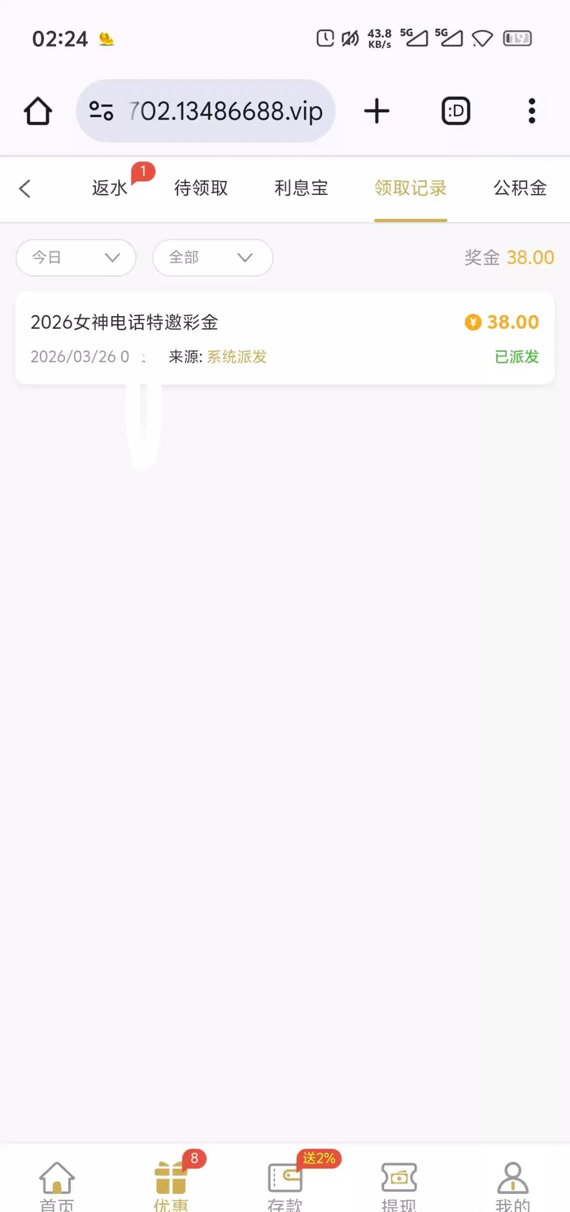 官网 5958.com 活动入口如图 注册了直接领取 不用绑定手机号就可以试能不能领取 领取了之后需要充值任意金额打38流水才能用 或者是提现 一杯水 我充值20 提了两百多到了 如图 要不要冲自己考虑 被黑不负责 得吃助力个有效谢谢