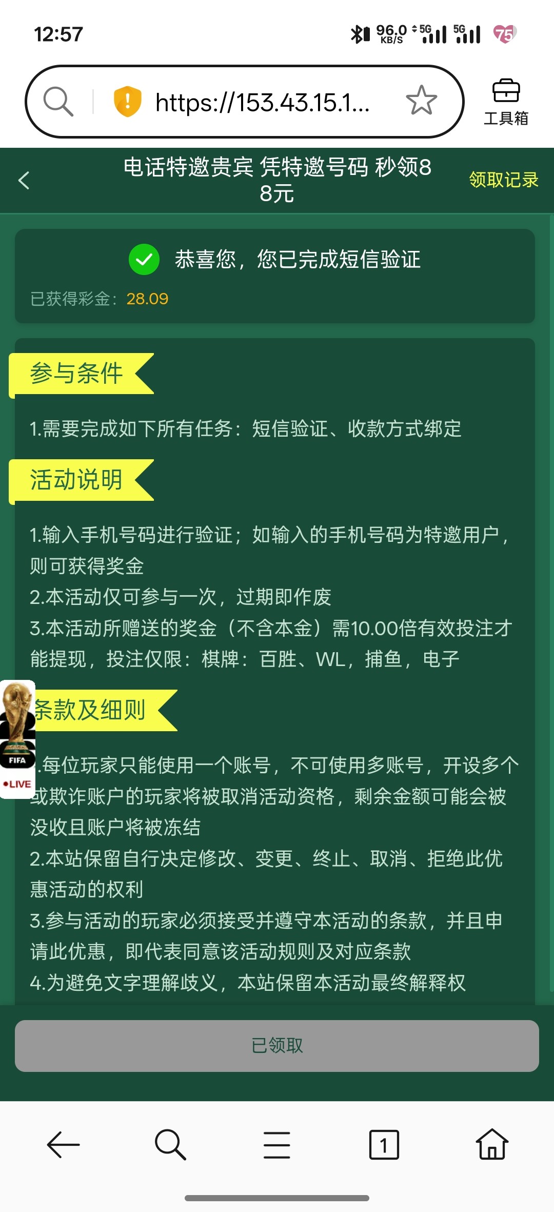 短信验证后领取28-88彩金