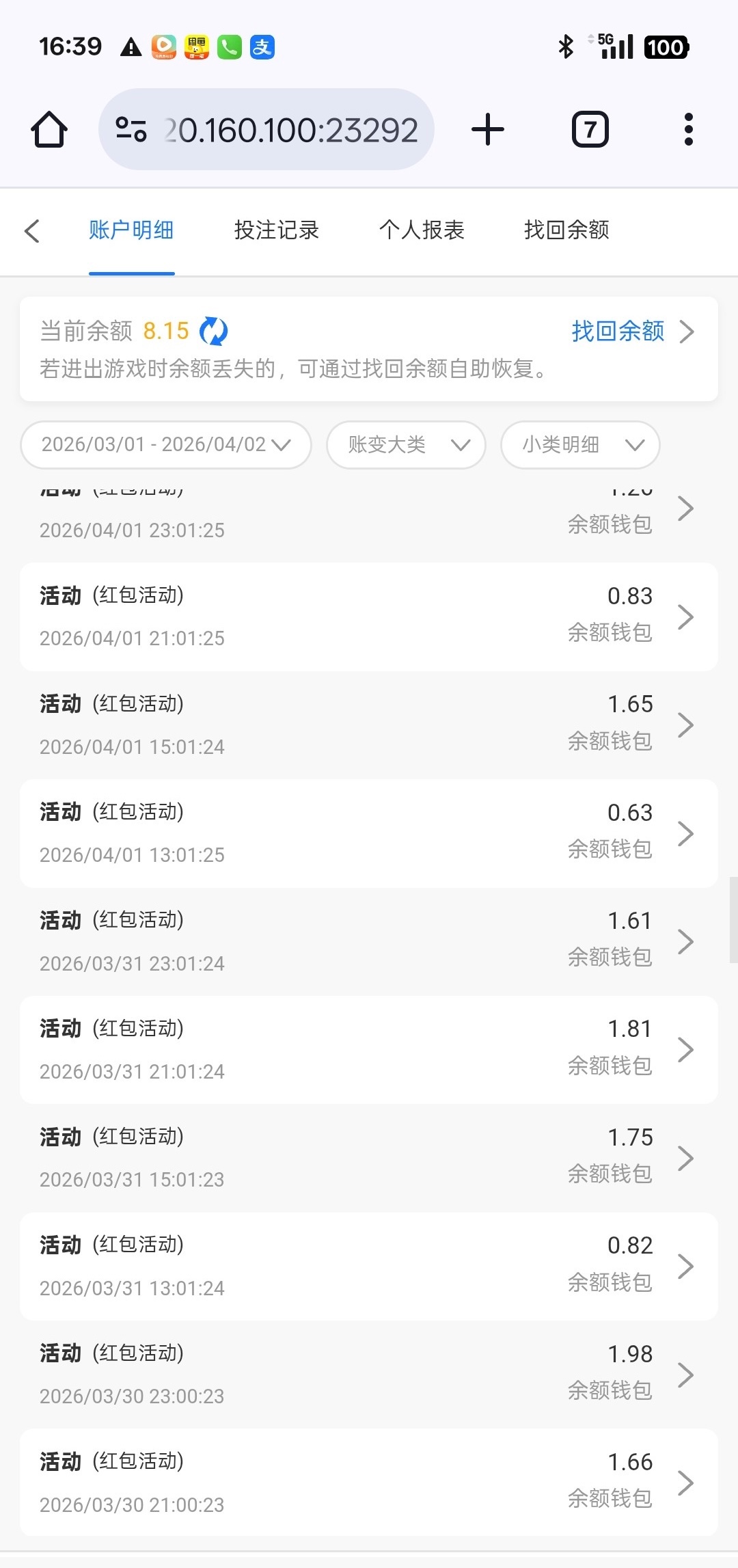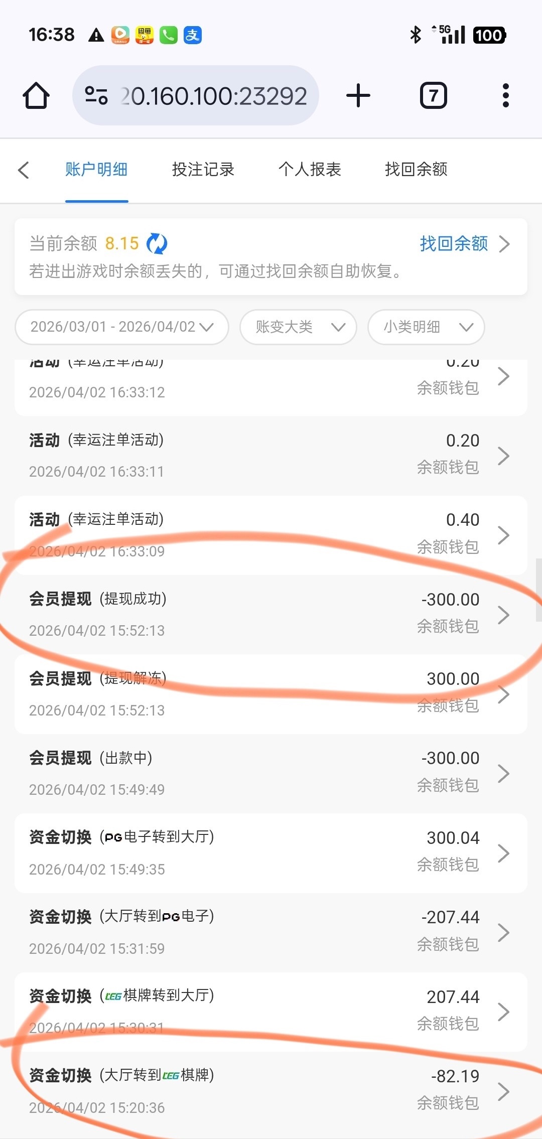 67.net 我也不知道因为啥,一个月以前充了200提1000说我多账号,退回了要打1000pg电子流水才能出款,然后洗白了,今天上去看了一眼有80多,看了记录才知道每天的三次红包我没抢他自动到账的我也不知道为啥,提了300竟然出了,另外一个没充值的我也上去看了下没有自动到账,充过值的去看看!