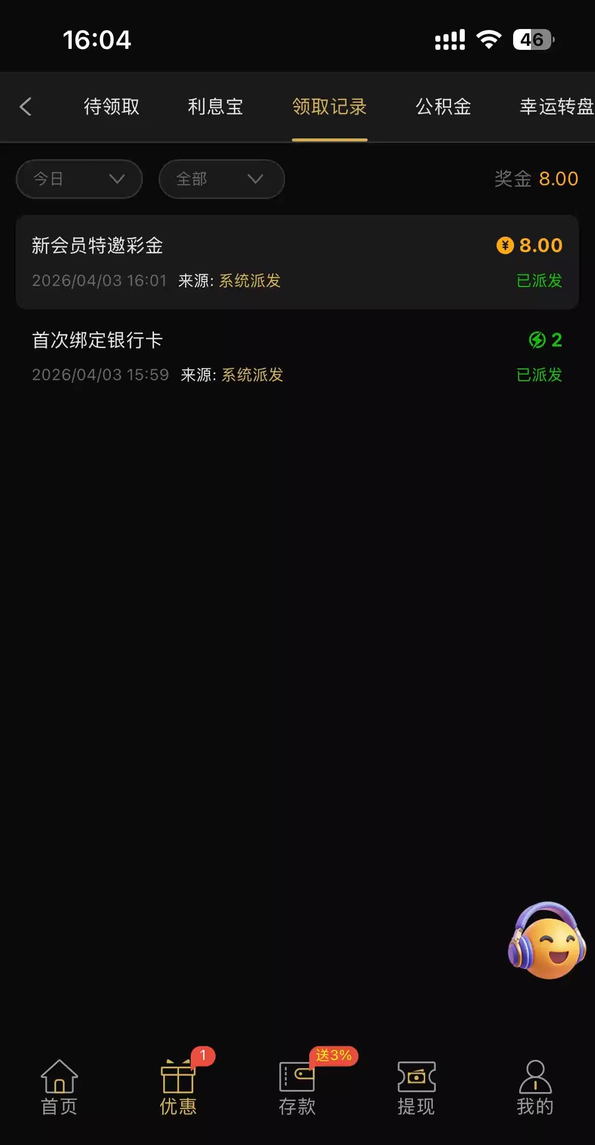 收到短信了可以去试试看,我申请到了8彩金