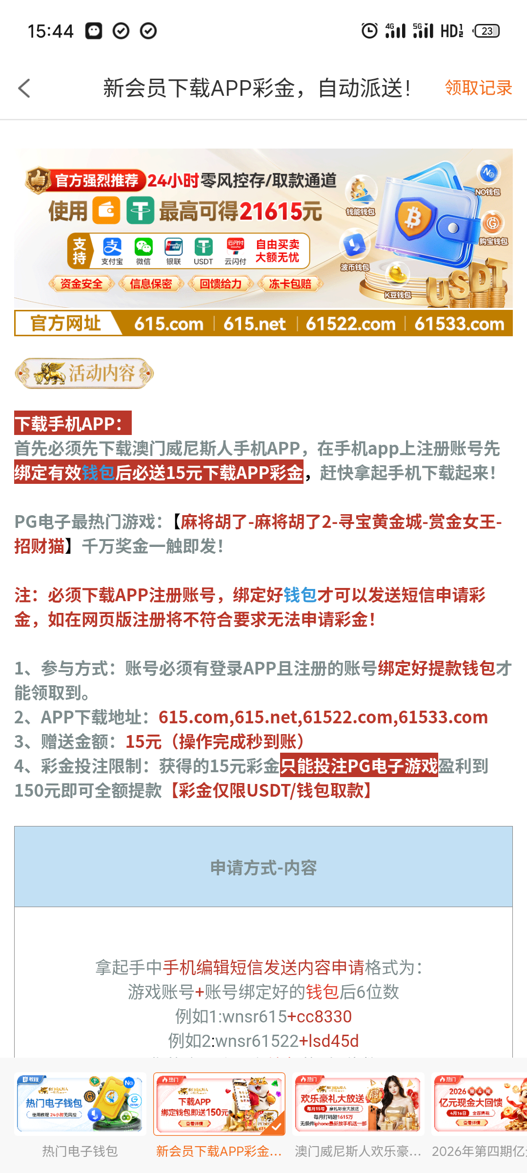 615澳门威尼斯发短信彩金和以小博大,下载app绑定数字钱包发短信15秒到 地址 615.com