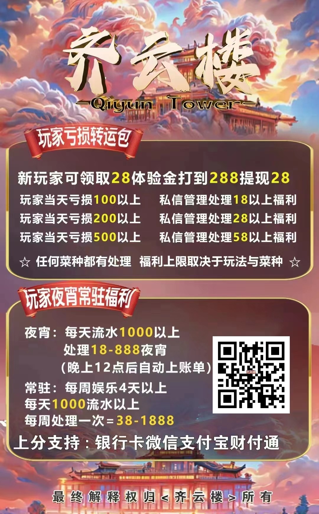 齐云楼数据重置了,体验金充值里面自己提交28充值即可,最低288提现兑换28