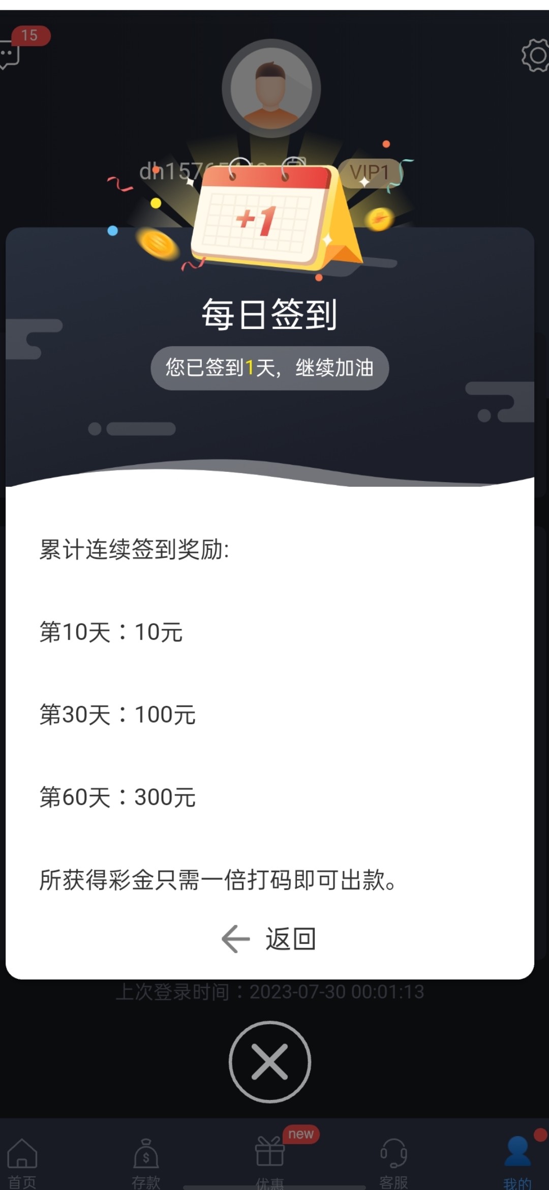 一周一循环,首次签到满10天送10,满30天送100,满60天送300。亲测到账,一倍流水就出款。