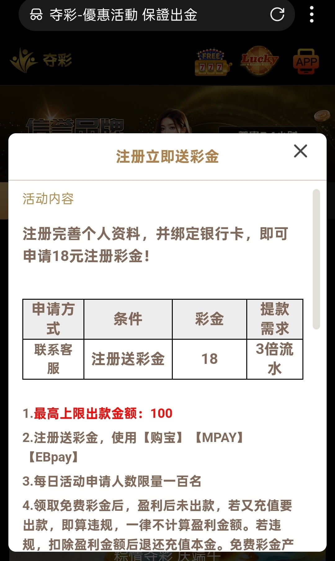 新用户下载APP注册绑定信息银行卡等自助申请18 申请不了去联系客服去申请18彩金三倍流水满100提现,每日限制100名额怕名额满的等明天申请