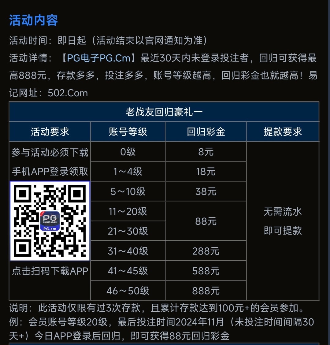 老平台回馈之前在平台有过充值100及以上记录的有回馈彩金 无需流水即可提现