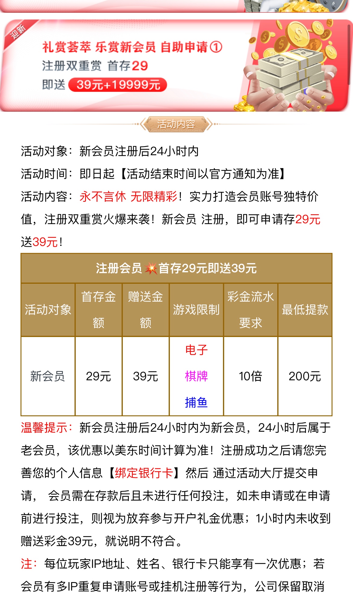 新用户注册完善个人信息首次完成存款即可联系在线客服 申请新用户首次存款29送39活动 最低200提现 十倍流水